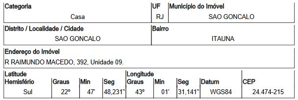 Localização: Casa em Endereço: RUA RAIMUNDO MACEDO | Bairro: ITAUNA | Número: N. 392 CASA 09 SAO GONCALO - RJ