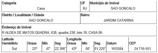 Localização: Casa em Endereço: RUA ALDEA DE MATOS QUADRA | Bairro: JARDIM CATARINA | Número: N. 638 QD 238 SAO GONCALO - RJ