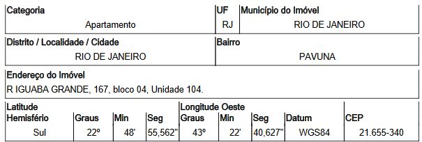 Localização: Apartamento em Endereço: RUA IGUABA GRANDE | Bairro: PAVUNA | Número: N. 167 APTO. 104 BLOCO 04 RIO DE JANEIRO - RJ