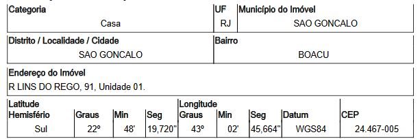 Localização: Casa em Endereço: RUA LINS DO REGO | Bairro: BOACU | Número: N. 91 CS 01 SAO GONCALO - RJ