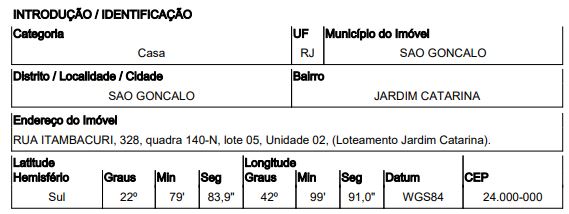 Localização: Casa em Endereço: RUA ITAMBACURI | Bairro: JARDIM CATARINA | Número: N. 328 LT 05 QD 140 N CS 02 SAO GONCALO - RJ